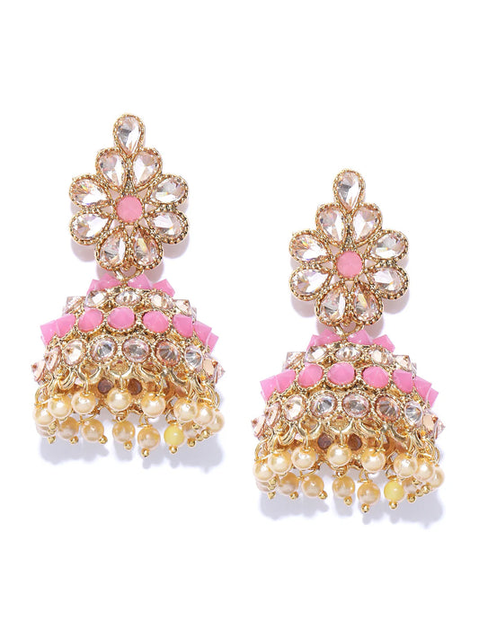 "Artificial Pink Gold-Plated Stones Studded Floral Patterned Jhumka Earrings for Women | Pink & White Traditional Ethnic Jewelry"