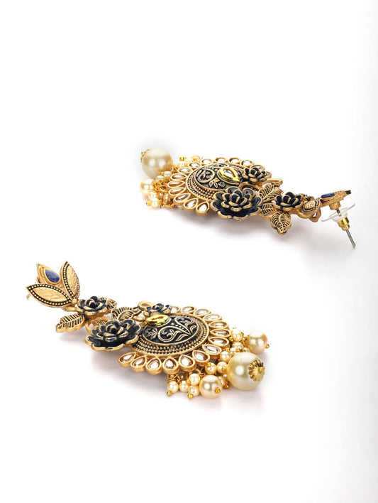 "Artificial Black Kundan Beads and Pearls Gold Plated Floral Drop Earrings for Women | Traditional Ethnic Jewelry"