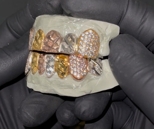 Tri-Color Diamond Cut & Diamond Dust with Iced Fangs Grillz