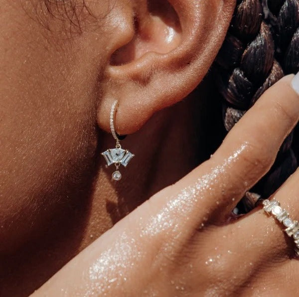 These stunning Ocean Fan Earrings are part of the Carly Cushnie for Starling collection. Delicate aquamarine fans and a diamond drop lightly swing from sparkling diamond hoops. Made with shapes and stones that evoke soft and strong, east and west, wisdom and authority.