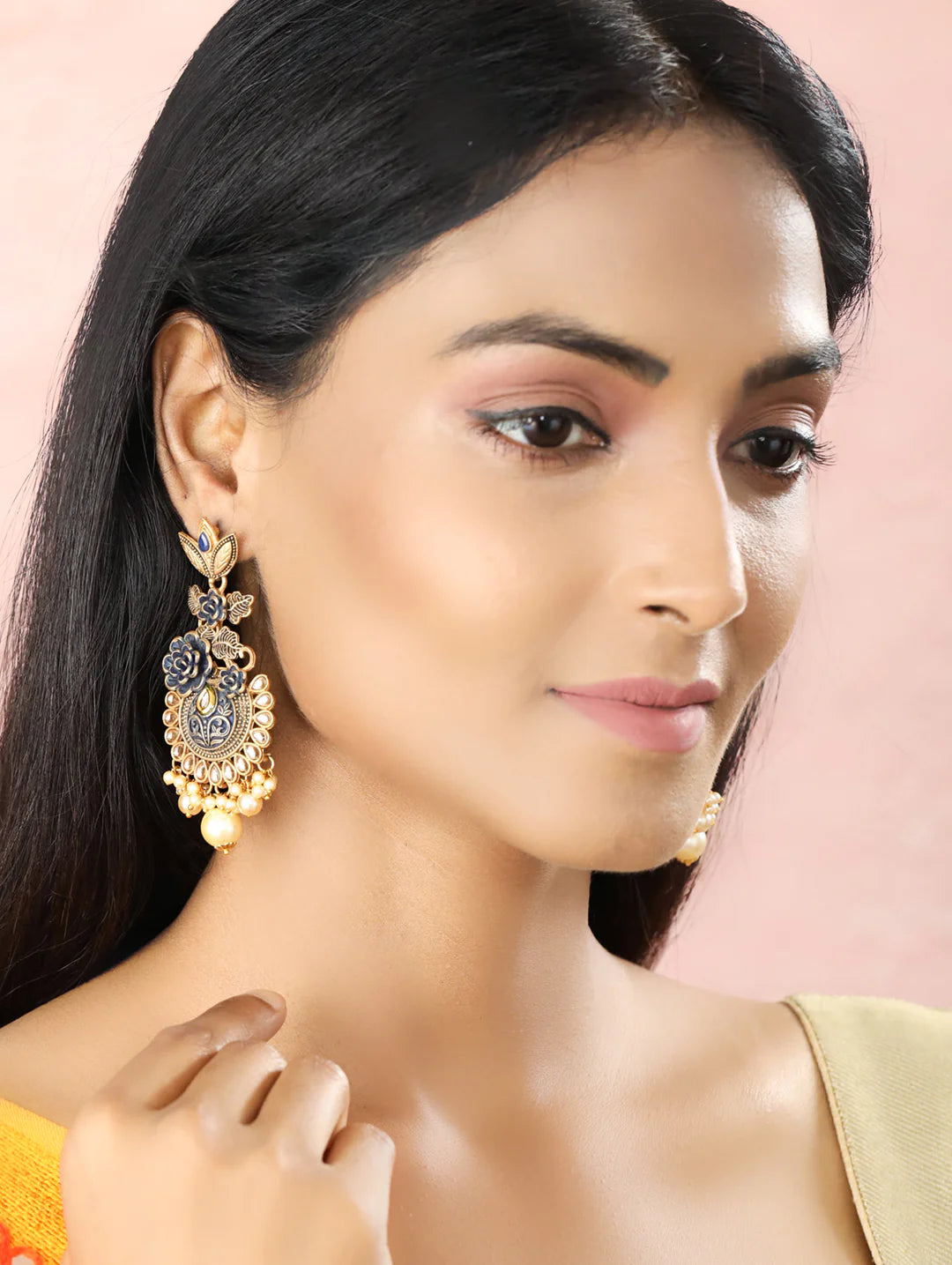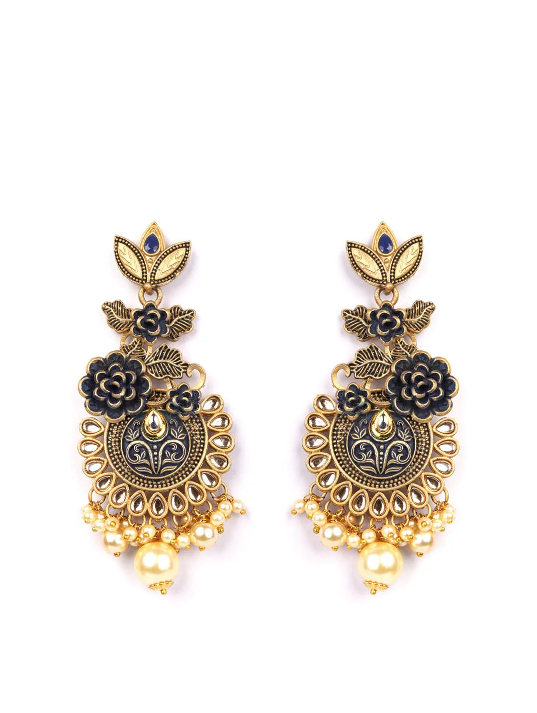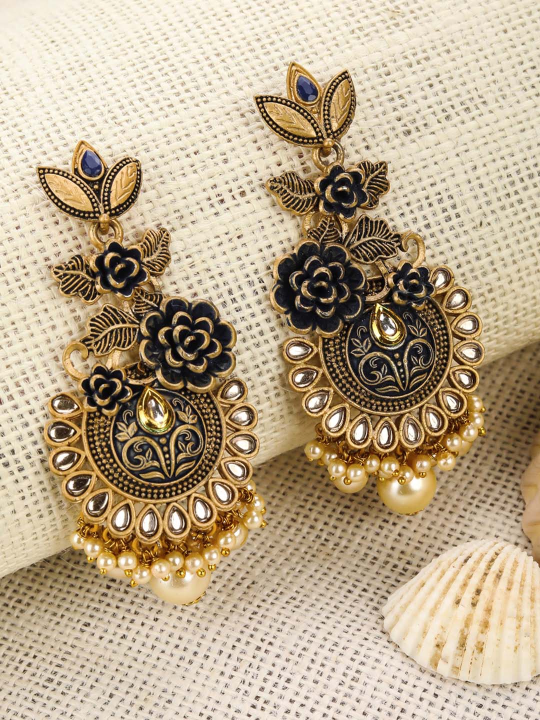 "Artificial Black Kundan Beads and Pearls Gold Plated Floral Drop Earrings for Women | Traditional Ethnic Jewelry"