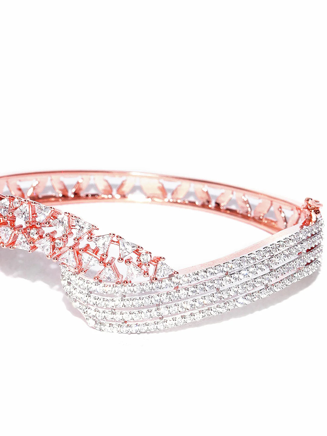 Celebrate your style with the exquisite Artificial Love Bound Rose Gold-Plated American Diamond Studded Bracelet for Women. Featuring a charming design studded with sparkling artificial American diamonds and finished with a luxurious rose gold plating, this bracelet perfectly blends elegance and contemporary fashion.