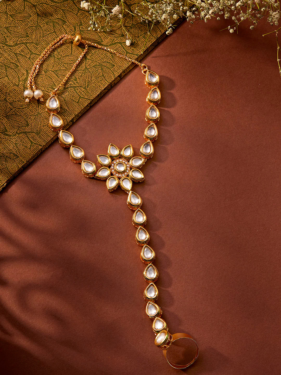 Elevate your traditional look with the exquisite Artificial Priyaasi Floral Design Kundan Gold Plated Adjustable Hathphool for Women. Featuring intricate Kundan work set in a beautiful floral design, this hand jewelry piece adds an elegant ethnic charm to any outfit.