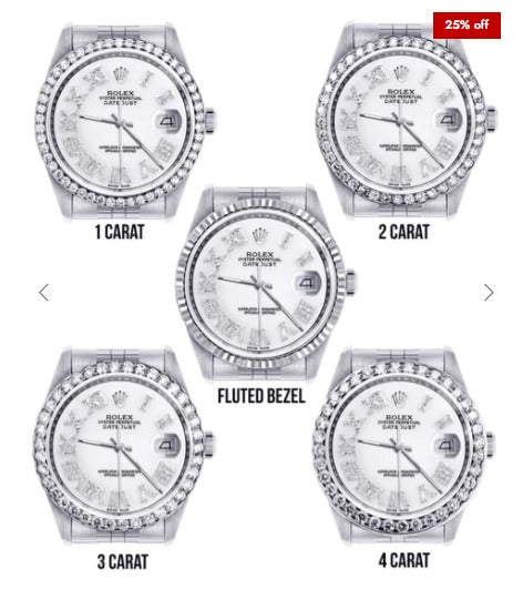 Rolex Datejust 36MM with a Jubilee Band. You can customize the bezel type between Gold Fluted Bezel or Diamond Bezel ranging from 1.00-4.00 carat. Below are more details of the watch.