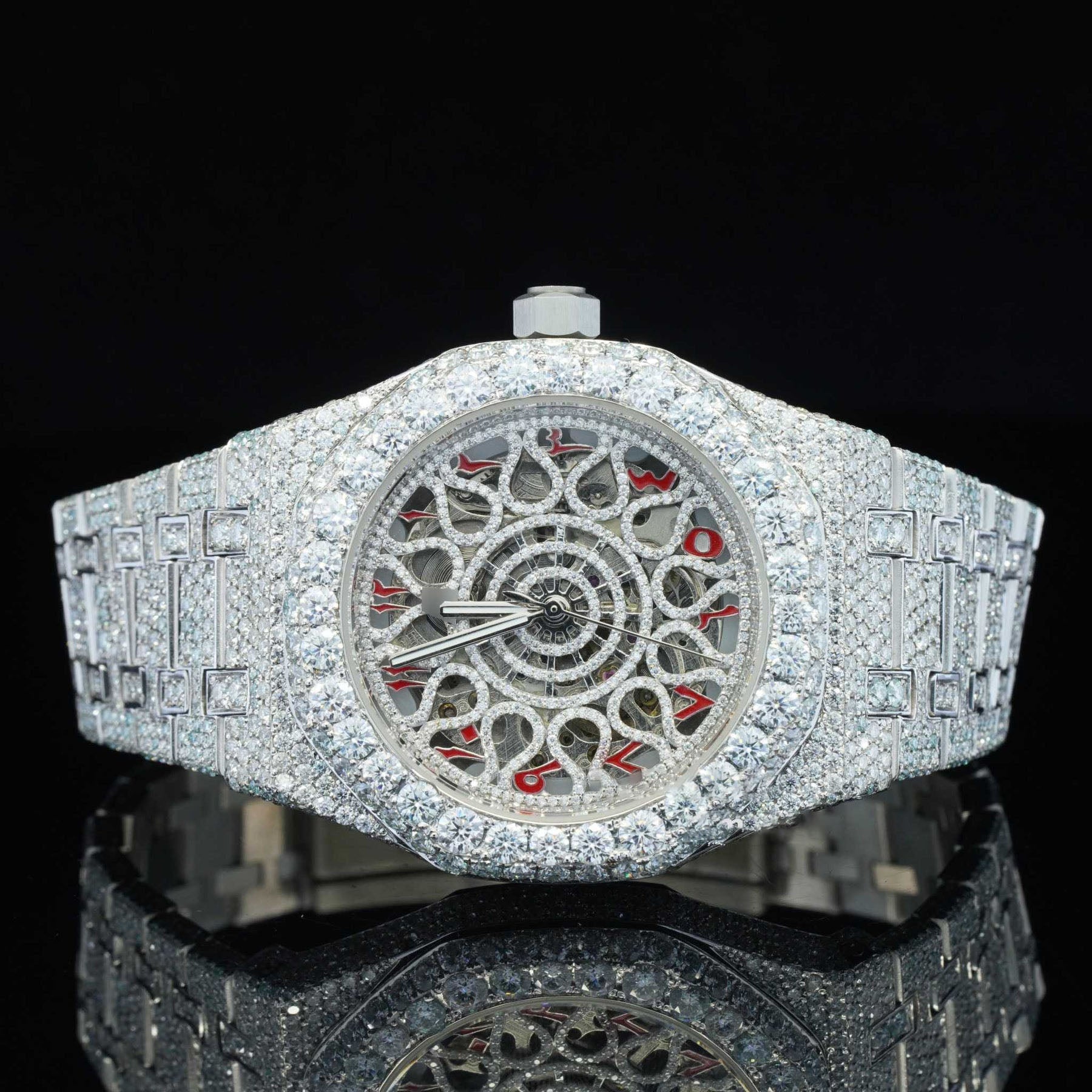 Iced-Out Moissanite Skeleton Watch – Red Arabic Numerals, Automatic Movement, Luxury Bling Timepiece for Men